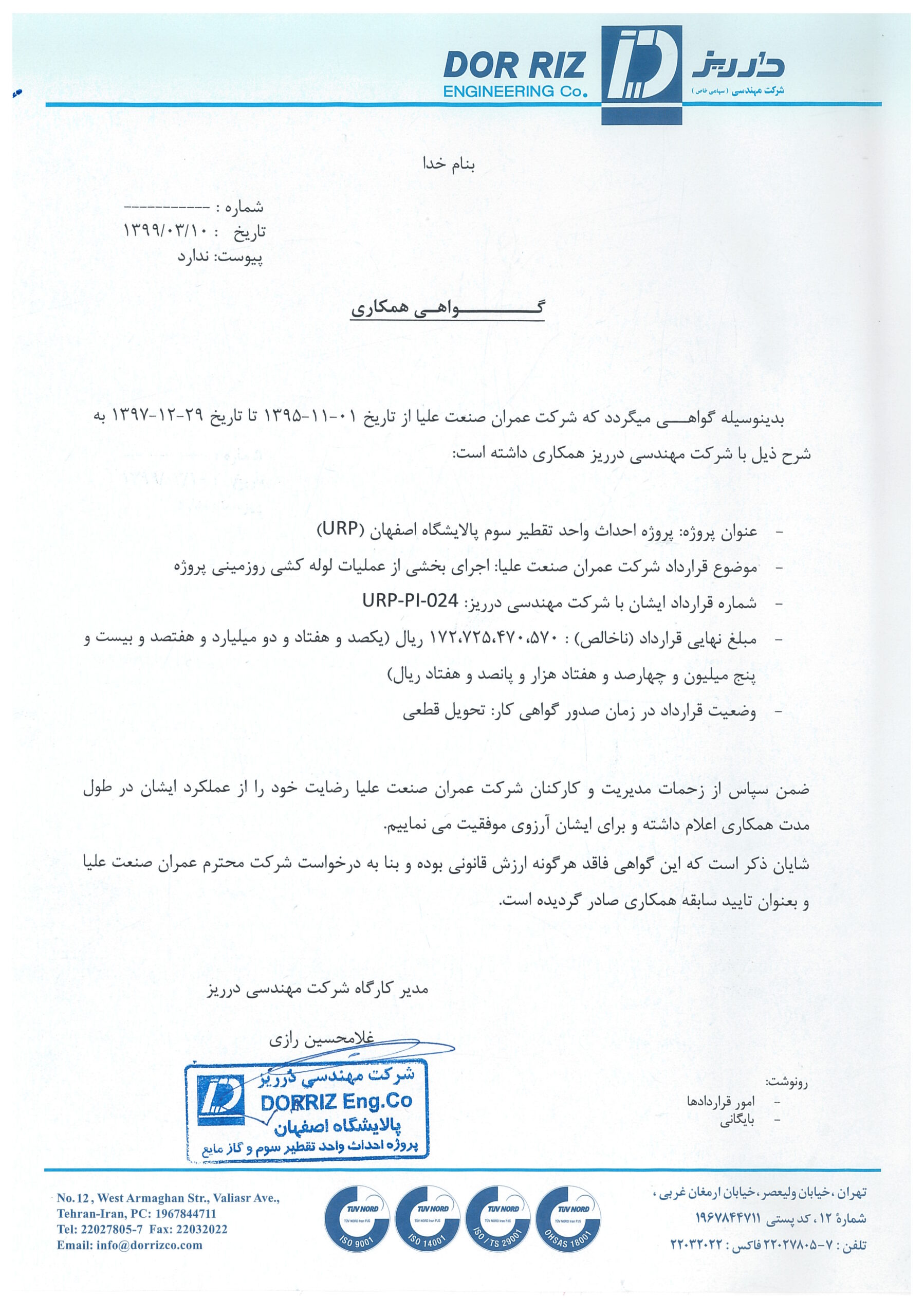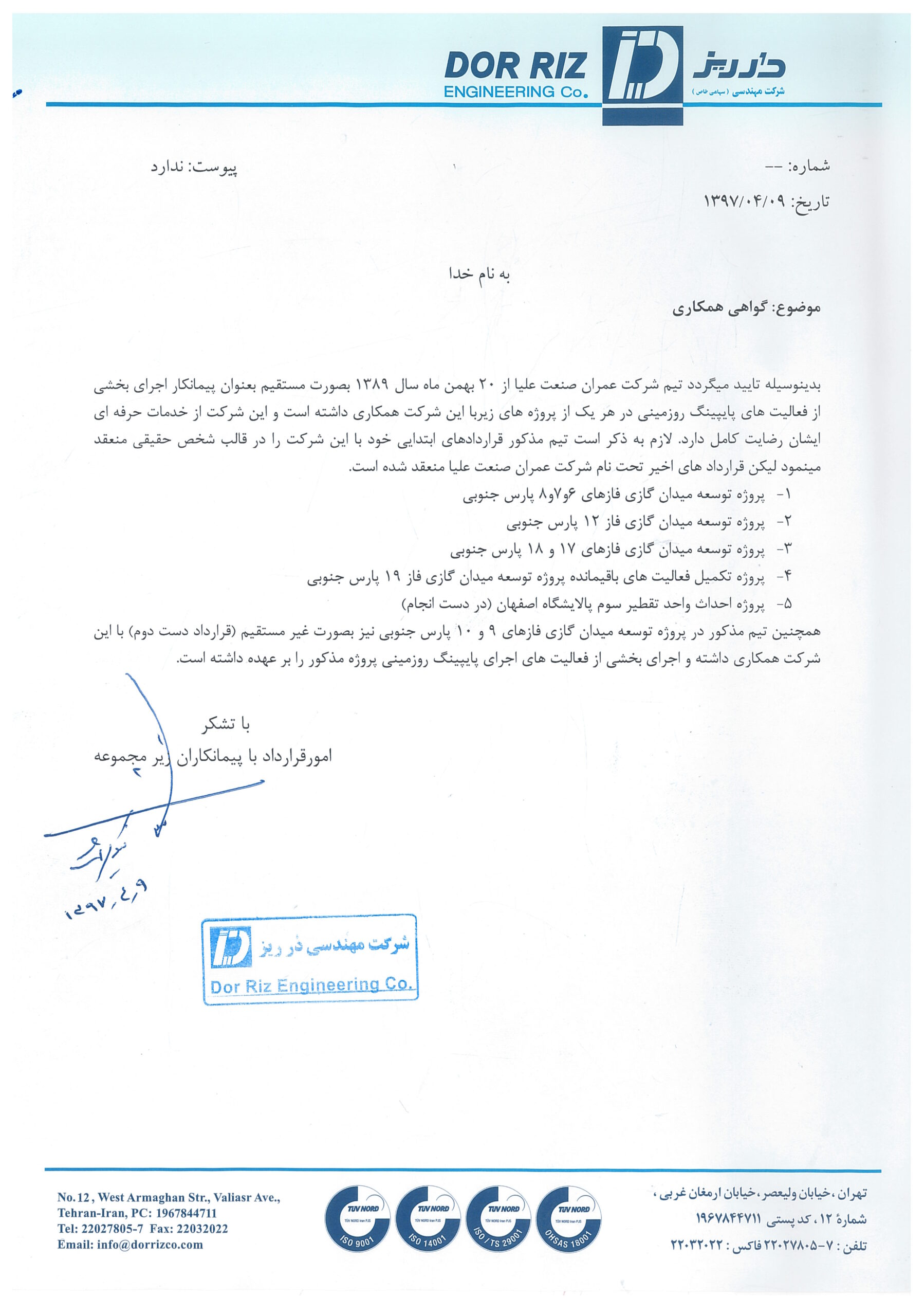 گواهی رضایت کار پروژه_های همکاری با شرکت درریز