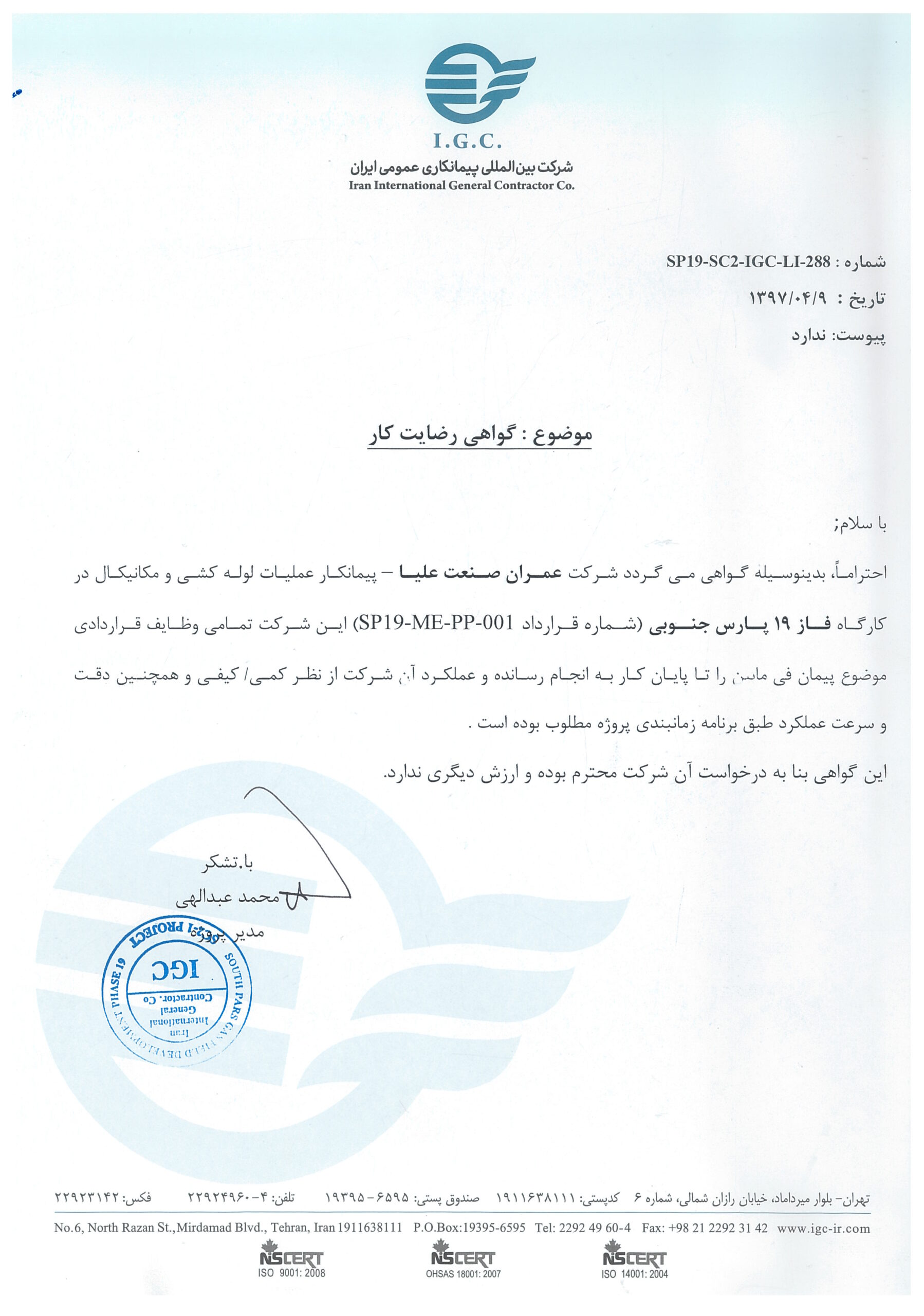 گواهی رضایت کار فاز 19 پارس جنوبی